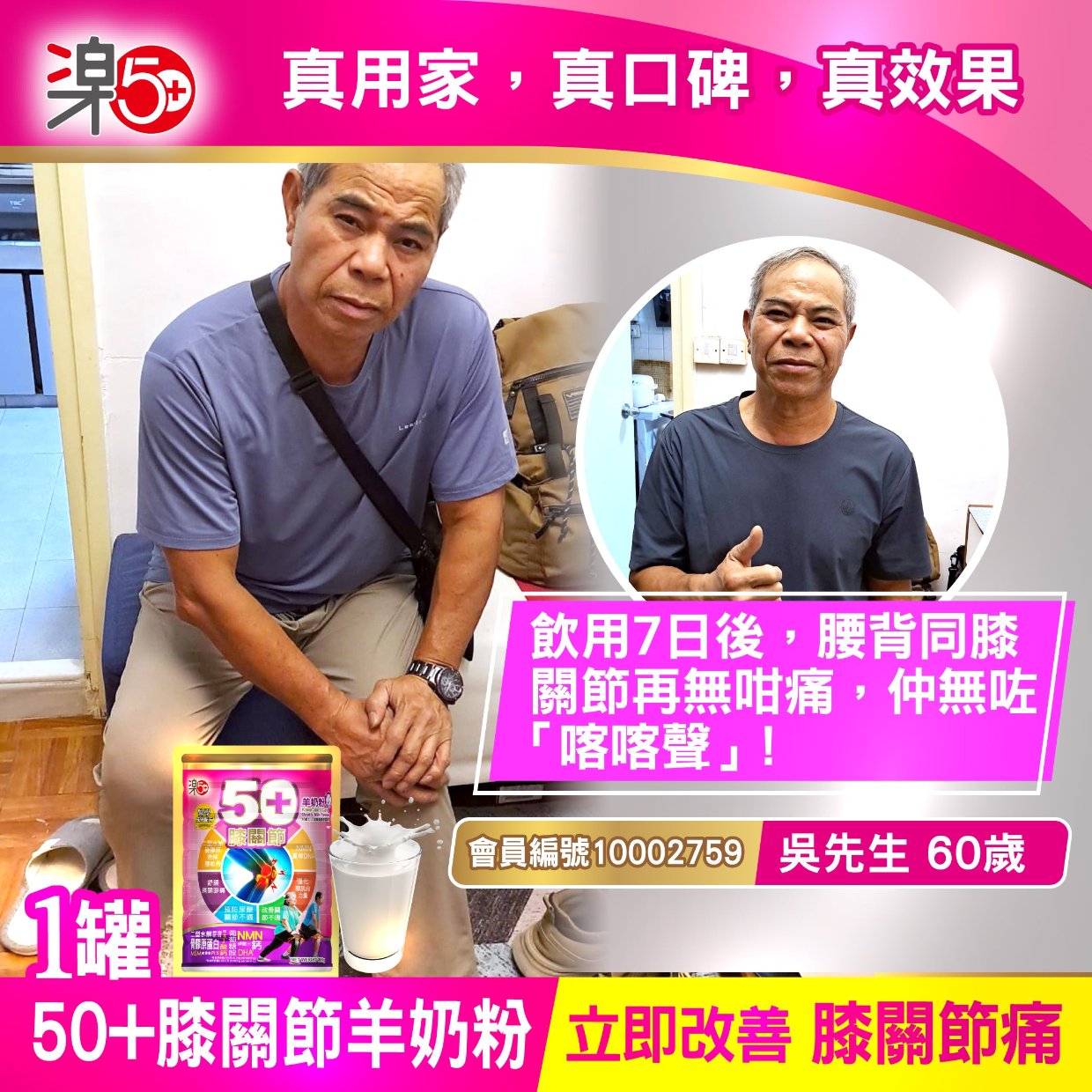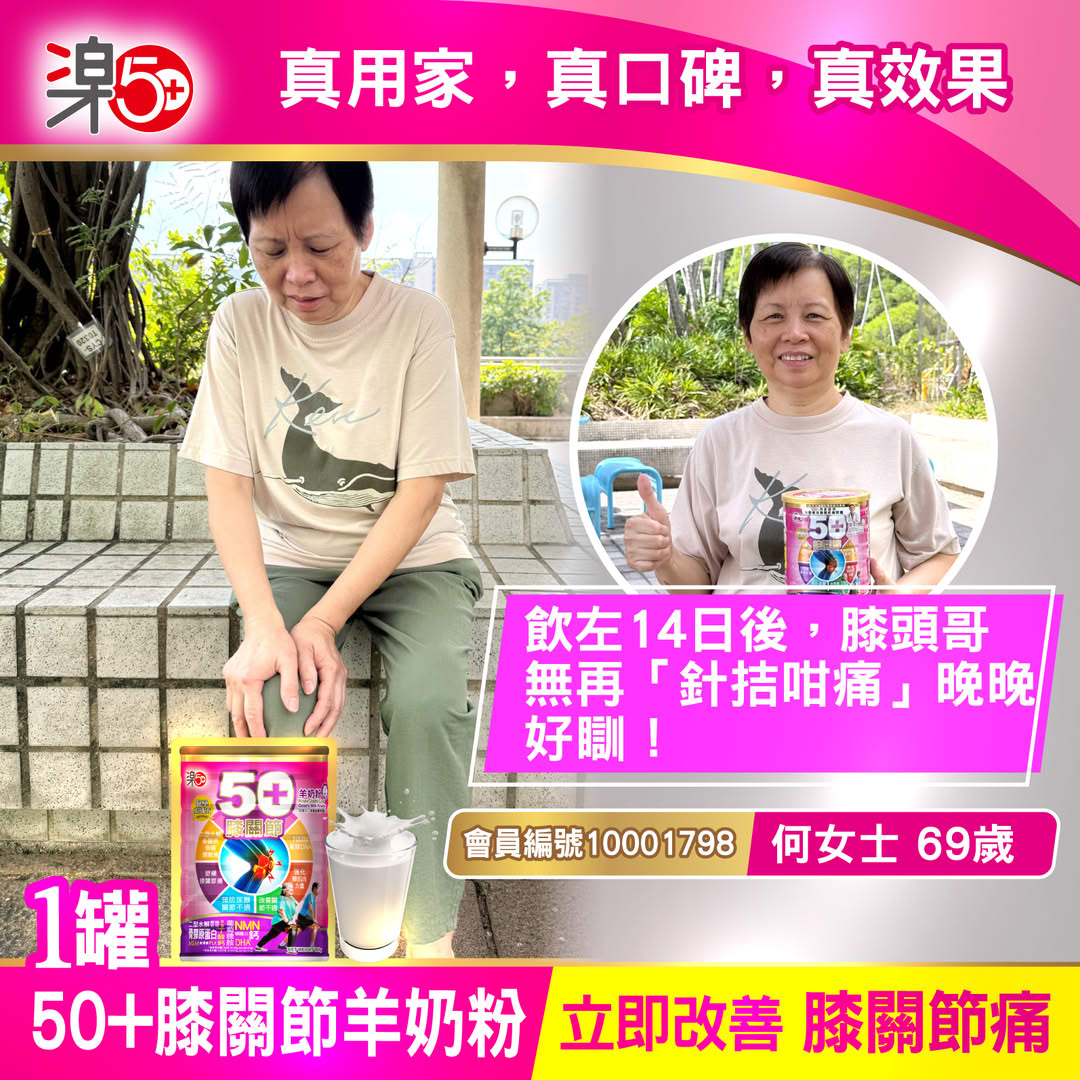 「我69歲,因為「軟骨磨損」,膝頭哥痛得好西利,尤其係夜晚,痛楚會加劇,好似「針拮咁痛」,痛到夜晚瞓唔着,日頭又無精神。試過食止痛藥,但效果都維持唔長。飲咗樂50+膝關節羊奶粉14日,膝頭哥針拮嘅痛真係「減輕咗好多,夜晚瞓得好啲啦!」而且,感覺身體都輕盈咗,精神都好咗好多。我會繼續飲落去,希望將來會有更好嘅改善!」
