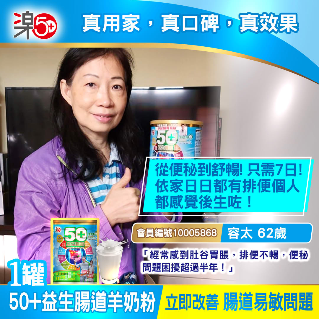 「我長期受腸躁症困擾,時肚痛時肚瀉,時便秘...出街一定要知道邊度有廁所,驚突然肚痛冇廁所去。連最鍾意嘅飲茶聚會都唔敢去,成日困喺屋企,生活好灰。」岑女士分享:「樂50+益生腸道羊奶粉徹底改變咗我嘅生活! 腸躁症嘅症狀少咗好多,肚痛嘅次數大幅減少 排便規律咗,唔再時便秘、時肚瀉 出街唔使再擔驚受怕,可以重新同老友聚會 夜晚飲一杯,個胃暖笠笠,瞓得好,精神好咗 唔甜!無羊羶味!