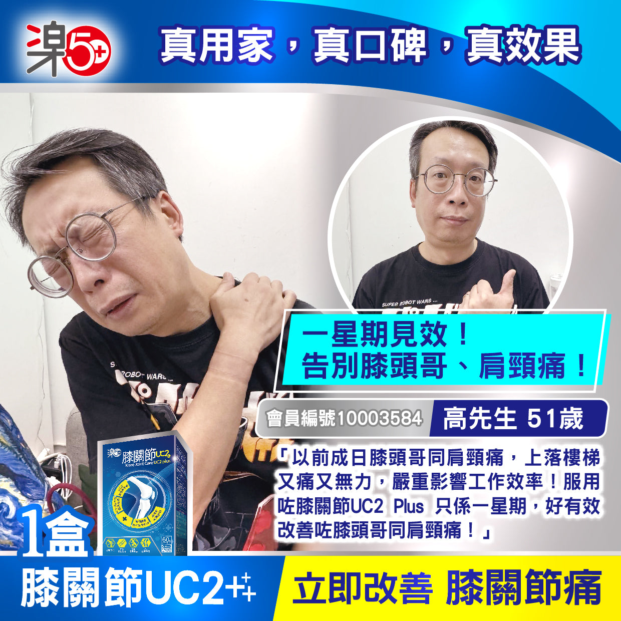 自從服用樂50+膝關節 UC2 Plus 只係一星期,情況就明顯改善咗!高先生話:「而家輕鬆好多,工作效率都提升咗!多謝樂50+,畀番活力我!」