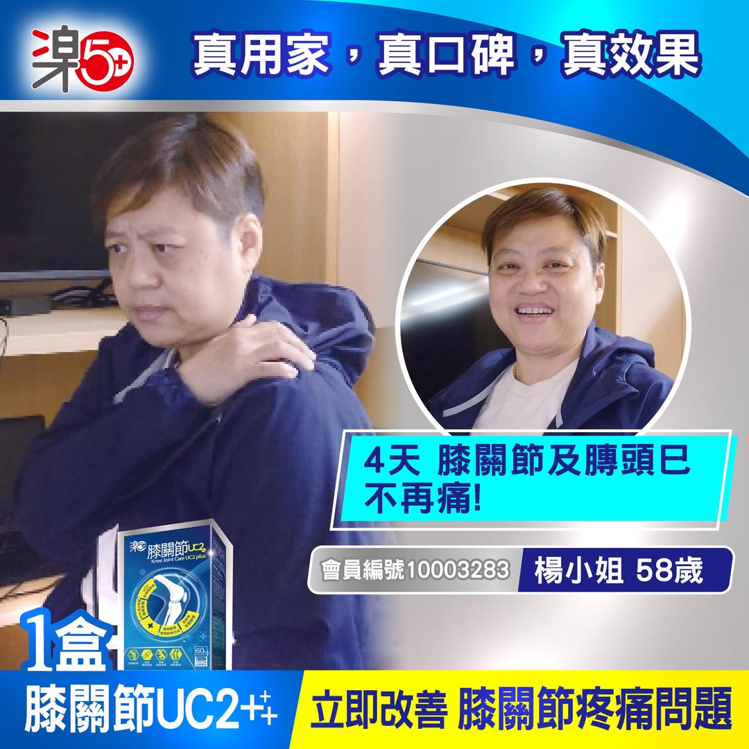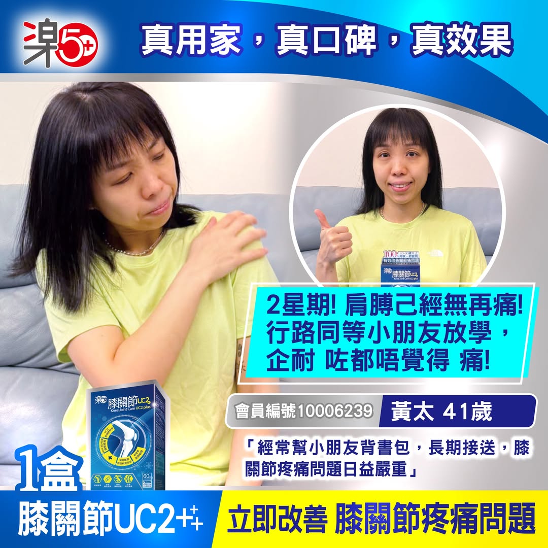 育有兩名兒子,日常需照顧他們上學放學,經常幫小朋友孭超重嘅書包,又要上上落落,肩膊同膝關節疼痛問題日益嚴重。為了解決這個困擾,喺Facebook睇到樂50+的其他用家分享後,她選擇服用樂50+膝關節UC2 Plus, 2星期! 依家肩膊己經無再痛! 上落樓梯同等小朋友放學企耐咗都唔覺得痛! 比之輕鬆好多!