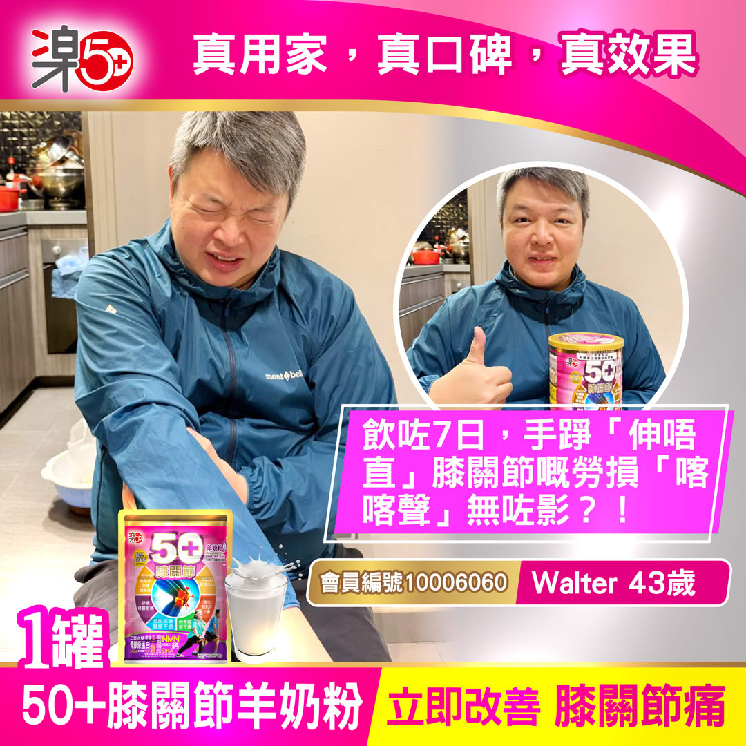 以前成日腰背痛、膝頭哥痛,仲有「喀喀聲」,真係好灰心!覺得自己老咗,好多嘢都做唔到… 飲咗樂50+膝關節羊奶粉7日之後,竟然有100%嘅明顯改善!「閃電痛」減輕咗好多,「無左喀喀聲」,真係好開心!依家可以輕鬆啲做嘢,同埋可以同朋友仔去行山,生活充滿希望!」
