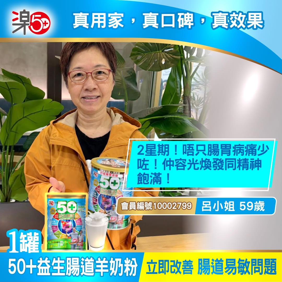 「最令我嘩然嘅係效果嚟得咁快!比起之前食嘅益生菌產品,樂50+益生腸道羊奶粉見效更快、更全面。而家朝早飲一杯,工作同生活質素都提升晒!」