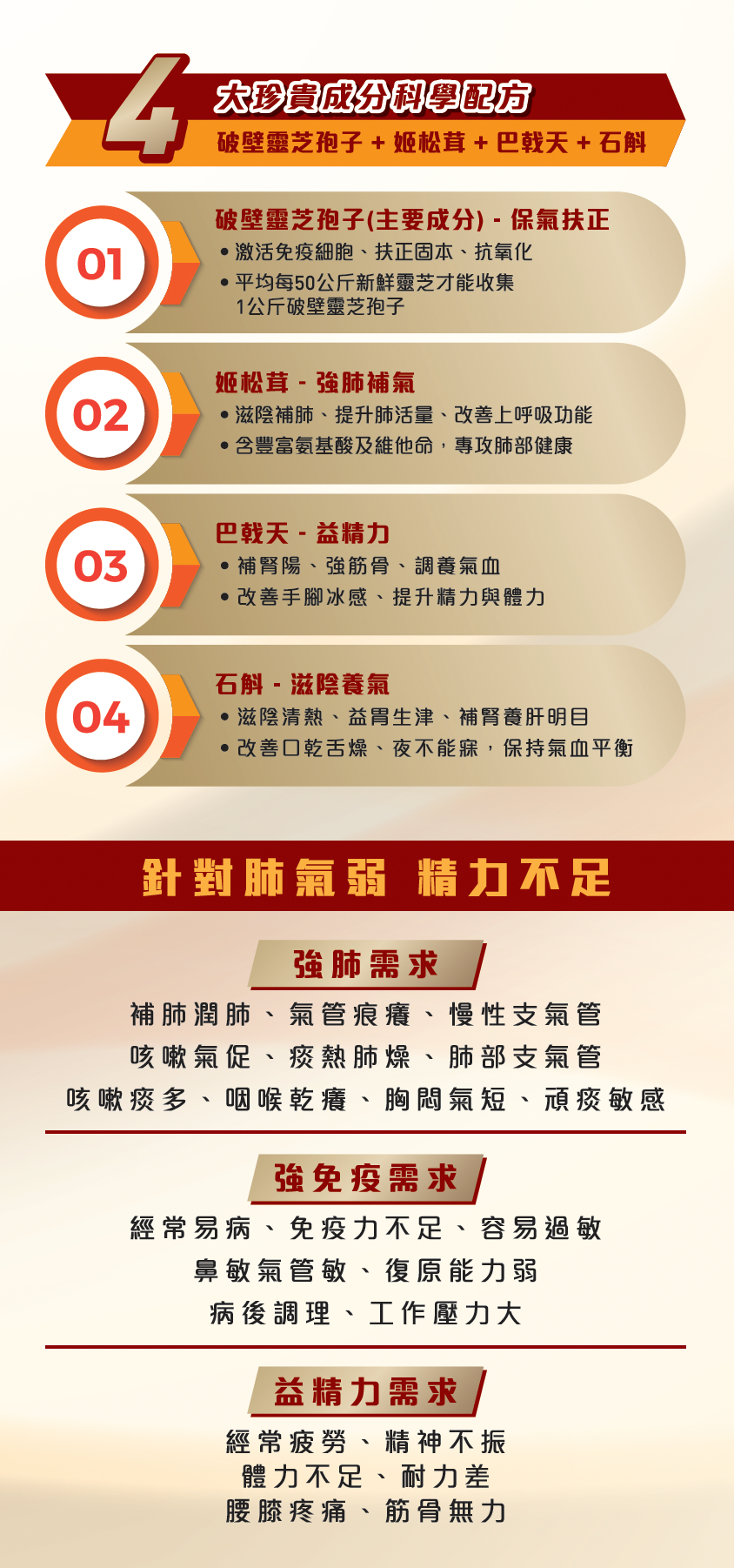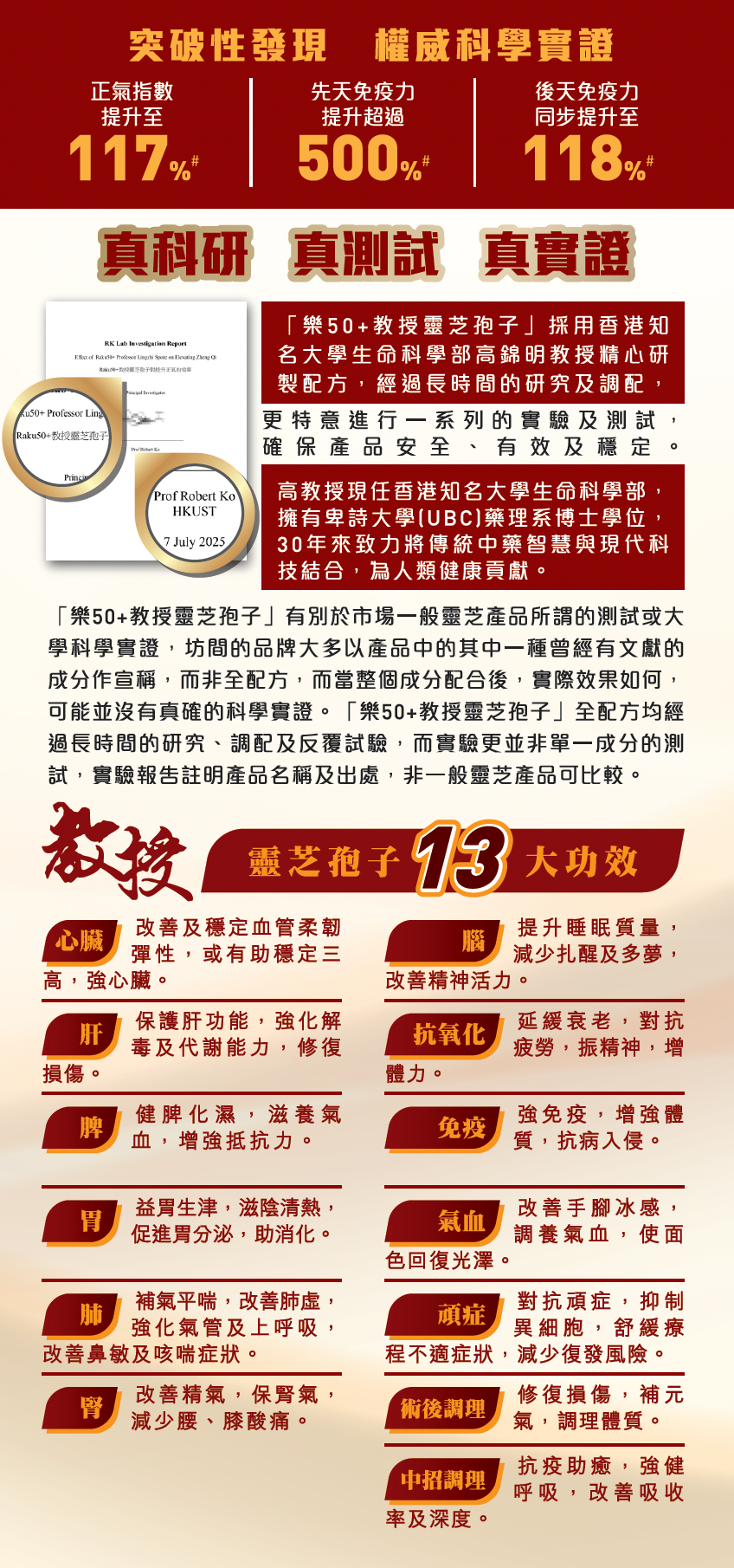 科研實證: 教授團隊發現,結合靈芝孢子、姬松茸、石斛同巴戟天等珍貴成分嘅黃金配方,可以喺短短3日內,就將免疫相關指標平均提升117%,達到「快見效、可長守」的免疫鞏固效果。